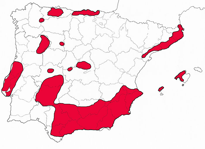Especie del centro y oeste del Mediterráneo, en la Península Ibérica se distribuye por el cuadrante sudoccidental, vertiente mediterránea, islas Baleares y vertiente norte de la Cordillera Cantábrica. Dispersa por algunos puntos del interior.